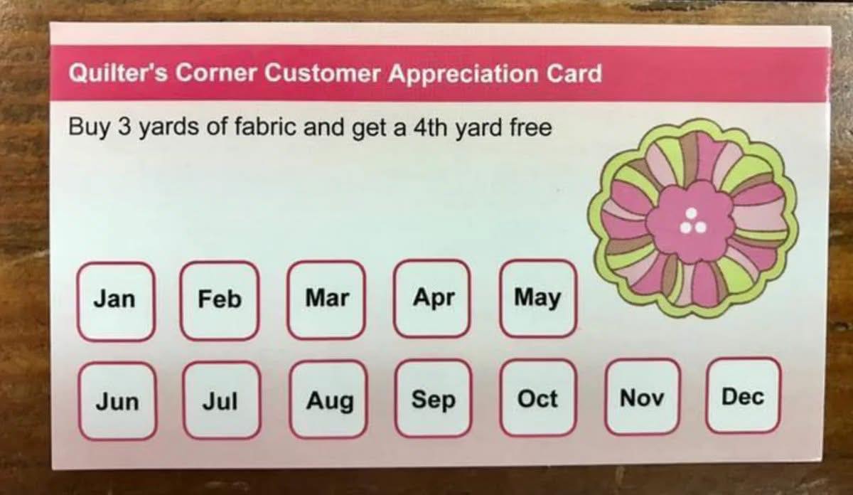 Utilize your card anytime during the month for all 12 months & get 12 yards of fabric FREE!