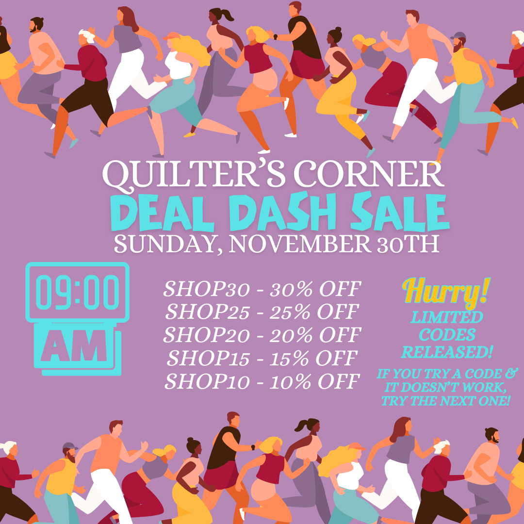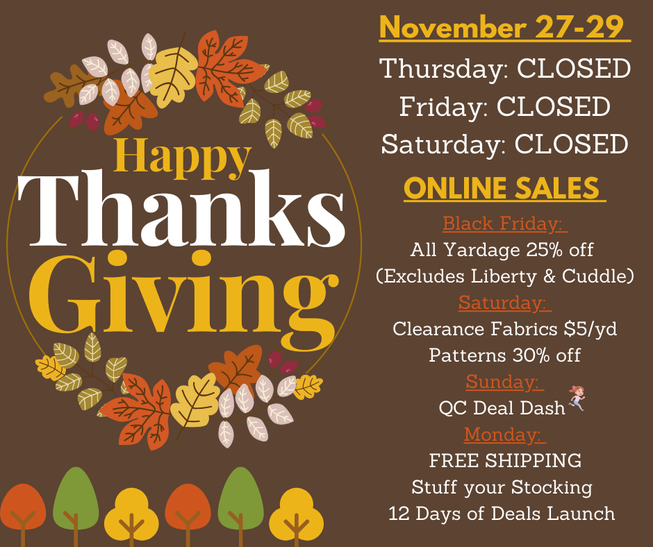 We’ll be taking a little break to spend time with family and refill our bobbins — so Quilter’s Corner will be closed Thanksgiving Day, Black Friday, and Small Business Saturday.