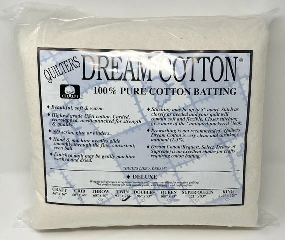 • Deluxe:  Weighty loft. Provides added warmth and weight offering extra emphasis for your quilting design. Great for machine quilting weighty quilts, wall hangings, bags, craft projects and much more. Available in Natural Cotton.