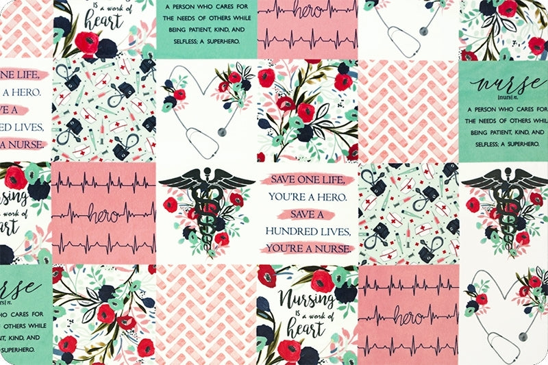 To honor the true heroes in our communities, we created an irresistibly-cozy quilt kit for all the doctors, nurses and paramedics who put their health and well-being on the line every day! Our Sensational Strips Cuddle® Kit Work of Heart includes pre-cut strips of Nurse Digital Cuddle® Spearmint, Lively Floral Digital Cuddle® Spearmint, Luxe Cuddle® Hide Rose Quartz and Luxe Cuddle® Galaxy Spearmint, as well as Luxe Cuddle® Hide Navy for the binding. The finished quilt comes in at approximately 58” by 73”, and we recommend using about 2 1/4 yards of Cuddle® 3 Navy for the backing (not included).