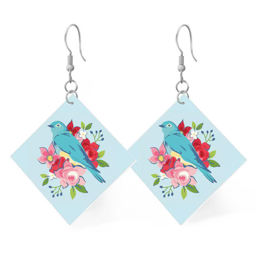 The Square Earrings by Riley Blake Designs are proudly American made by hometown artisans. They are crafted from 100% full-grain leather and are hypoallergenic. These lightweight earrings feature a bluebird. Earring size is 1" x 1". Hang is 2".