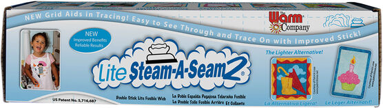 Warm Company Lite Steam A Seam 2 double stick fusible web. Pressure sensitive on both sides for a temporary hold to both the applique and background materials: pieces stay in place and are repositionable until fused with an iron. Once fused, the bond is permanent and machine washable and dryable. Lite is made especially for sheer and light weight fabrics and regular for use with heaver fabric, paper, cardboard, wood and glass beads. Quickly create hems, seams and applique. Easily apply lace, trim and ribbon.