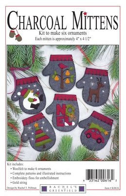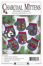 Charcoal gray mittens sporting perky red cuffs are adorned with a partridge in a pear tree, snowman catching snowflakes, geometric tree, NOEL, car bringing home the Christmas tree, and a jaunty reindeer. The opening at the top of each mitten is perfectly sized for gift cards or other treasures Make them for the tree or for gift giving! Each mitten is approximately 4" x 4 1/2". Kit Includes: Woolfelt, embroidery floss for embellishing stitches and gold string plus precise patterns and illustrated instructions to make 6 mitten ornaments. Colors are charcoal, red, green, gold, white, brown, and black.