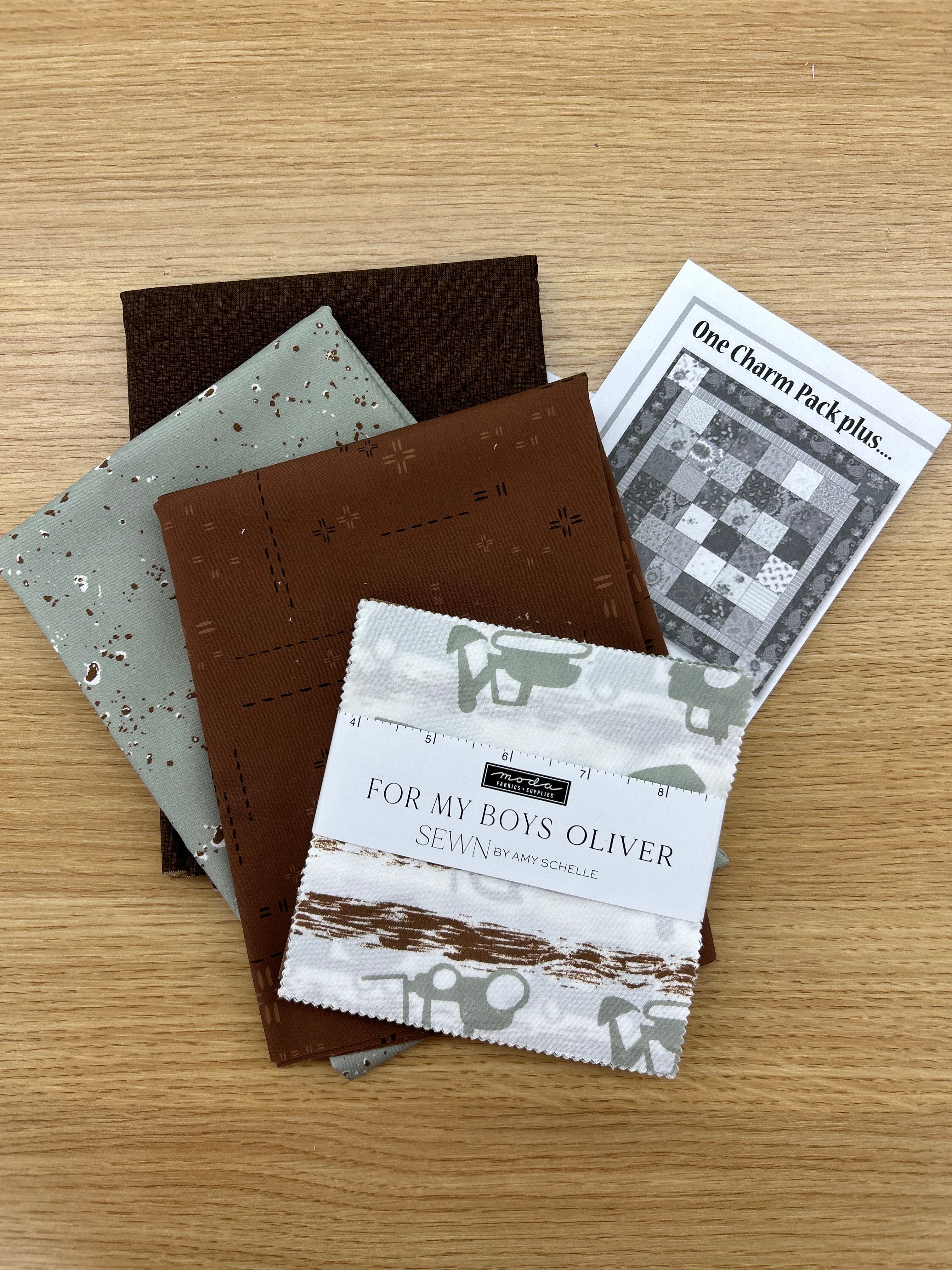 This charm kit features the adorable For My Boys Oliver charm pack, highlighting charming minty sage greens and deep, muddy browns—perfectly sweet for any little guy. The kit comes with the pattern plus fabric for the quilt top and binding. Finished size is 36 x 36 inches.