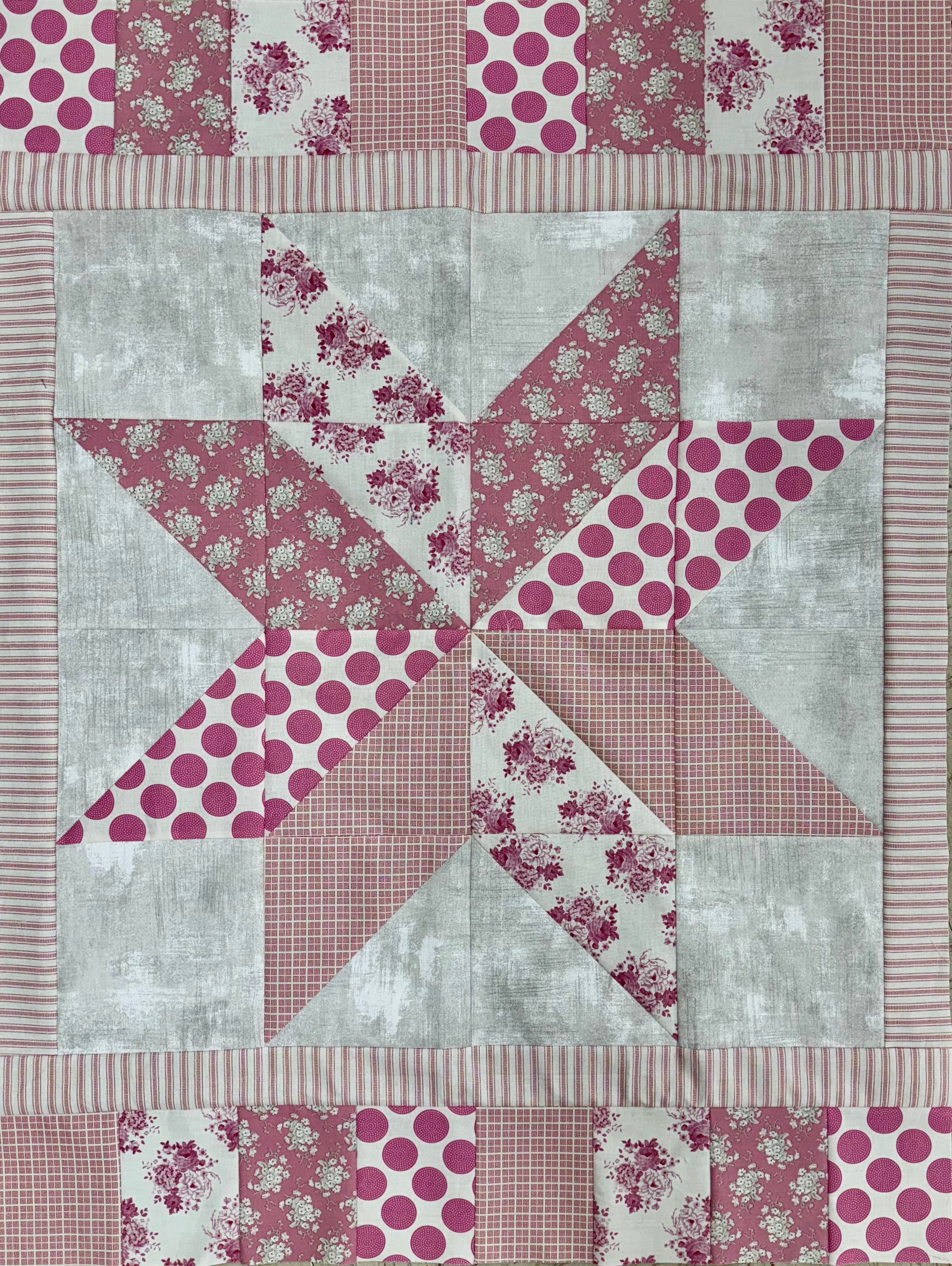 Measures 32x42. Kit comes with Villa Rosa pattern "Silver Star" and Tilda's Sunday Brunch fabrics for top & binding.