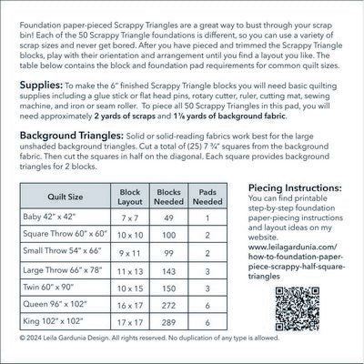 50 different 6” Scrappy half-square Triangle designs are included in this foundation pad. The foundations are printed on lightweight foundation paper so they are easy to see through and remove. The Scrappy Triangle foundation pad includes supply/fabric requirements, a link to an in-depth tutorial and video, and 50 different Scrappy Triangle foundations. There are enough foundations in each pad to make a 42” x 42” quilt.