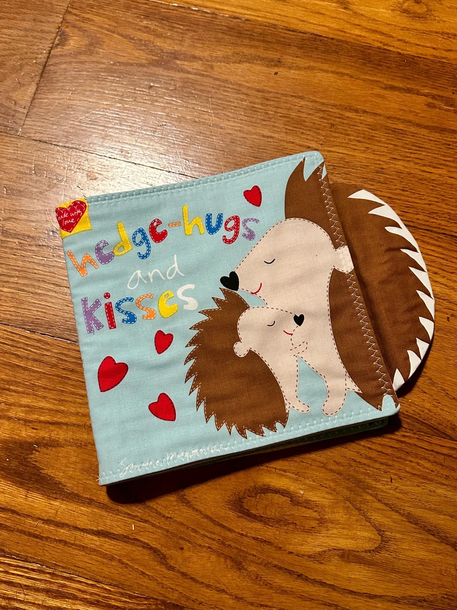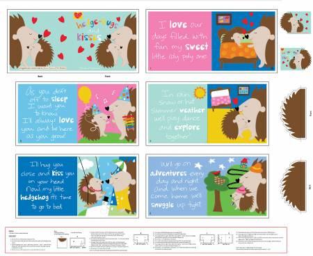 New. Fabric Book Panel. Hedge-hugs and Kisses fabric book panel is about a Mommy and Baby Hedge Hog. "I love our days filled with fun my sweet little roly poly one!" Fabric is part of the Huggable & Loveable Collection by Sandra Magsamen for Studio E. (2024) Cotton Fabric. 35"x44", pages aprox 9"x9"