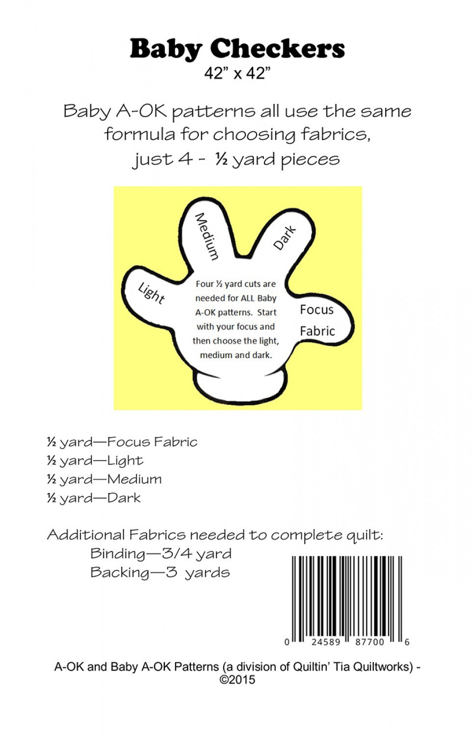 Quilt measures 39in x 43in Strip pieces block design makes for a fast and easy baby quilt. A feature print shines as the border, while the light, medium and dark do the work of contrast in the center. Every Baby A OK pattern uses just four 1/2 yard cuts of fabric 1/2 yard of a theme print, then 1/2 yard of a light, medium, and dark. Any bundle that is chosen using the formula will work with any Baby A OK pattern (4 pages).