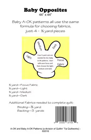 Another EASY Baby A-OK Quilt. 44" x 44". Uses just 4 half yard cuts (main print, a light, a medium, and a dark) to create this great baby quilt. Binding is another half yard, backing is 3 yards. All our Baby A-OK patterns use the same amounts of fabric and are easily kitted.