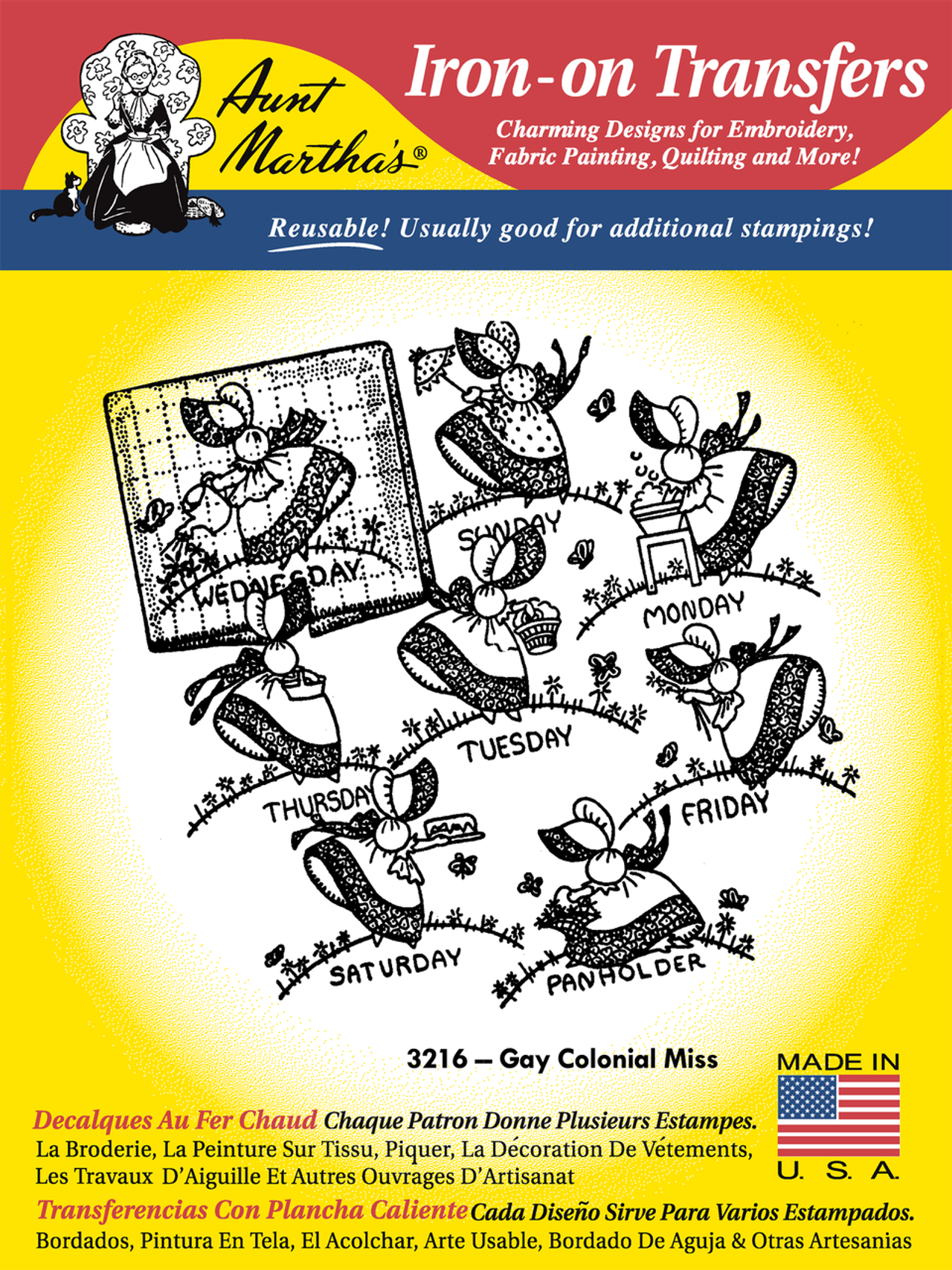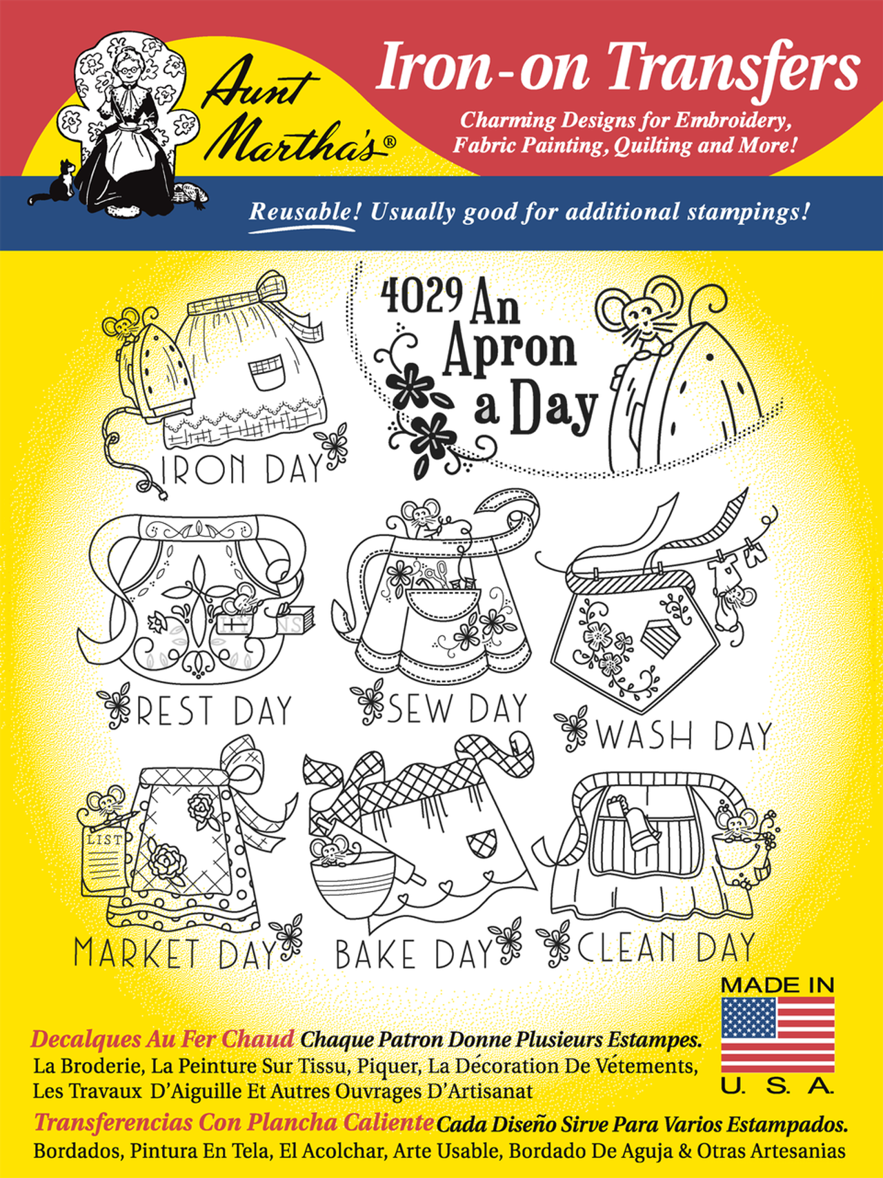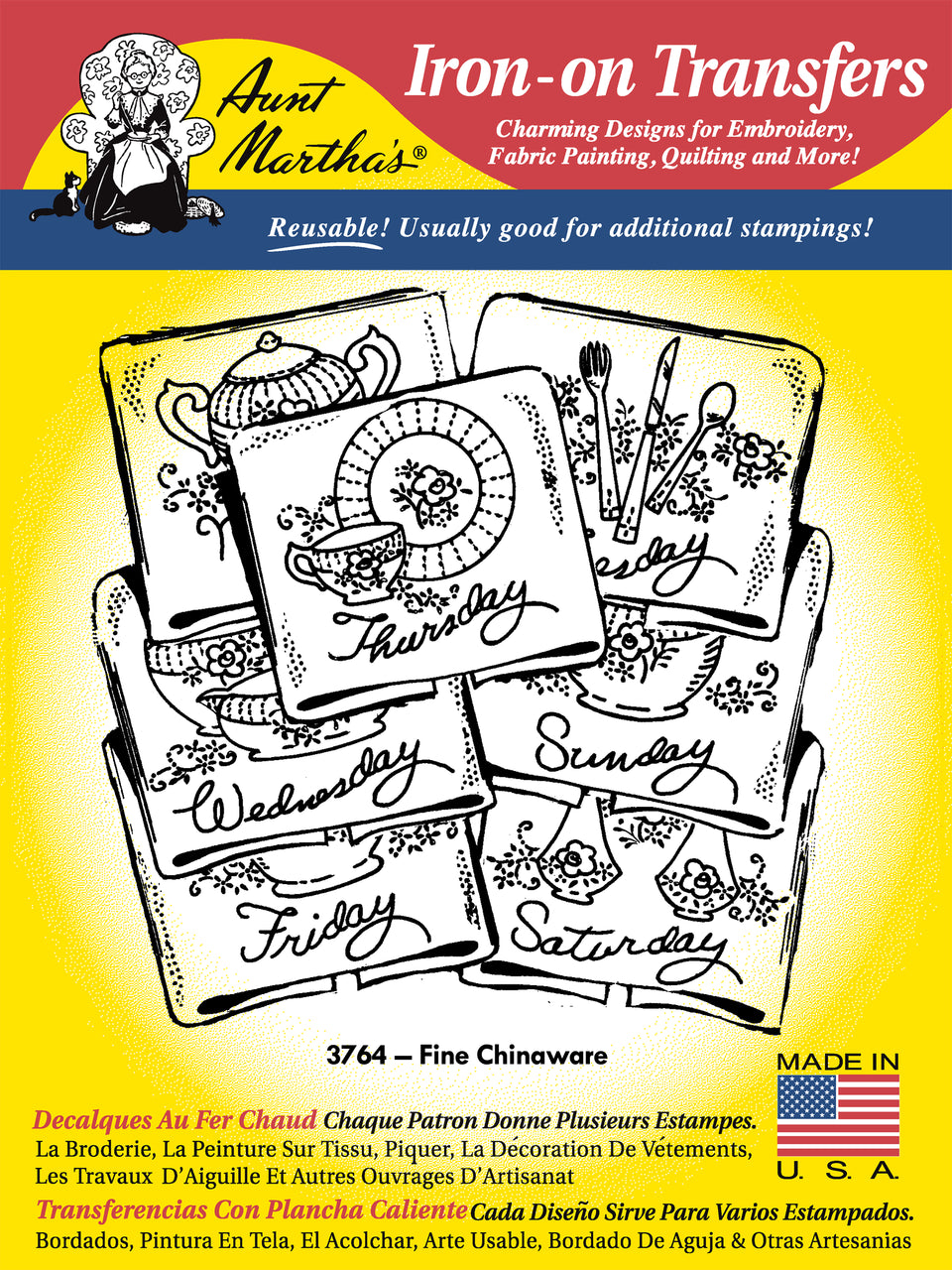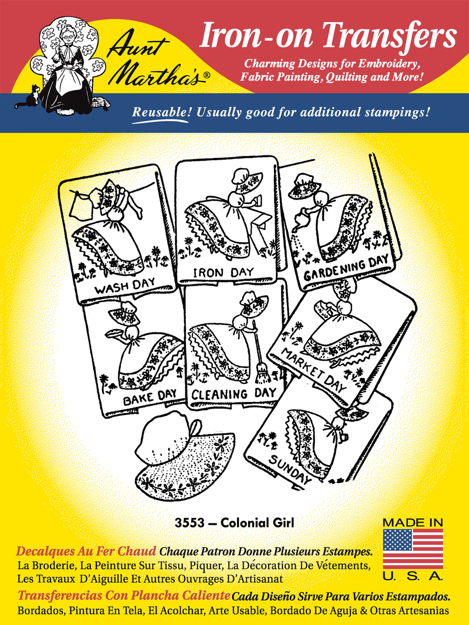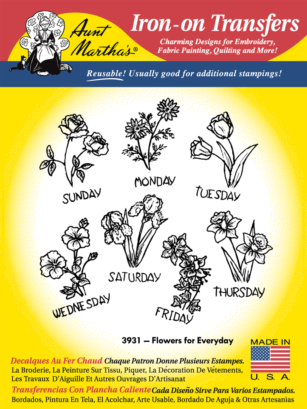 Aunt Martha's Embroidery Transfer Patterns with Days of the Week (DOW) designs. Many of these embroidery designs will feature the traditional old-fashioned chores for each day of the week ~ Monday (Wash Day), Tuesday (Iron Day), Wednesday (Mend Day), Thursday (Market Day), Friday (Clean Day), Saturday (Bake Day), Sunday (Rest Day). Transfer the pattern onto your fabric with a hot iron... use hand stitch embroidery or liquid embroidery paints to finish!
