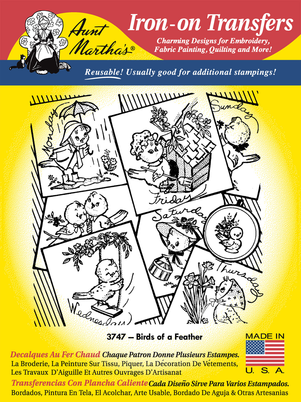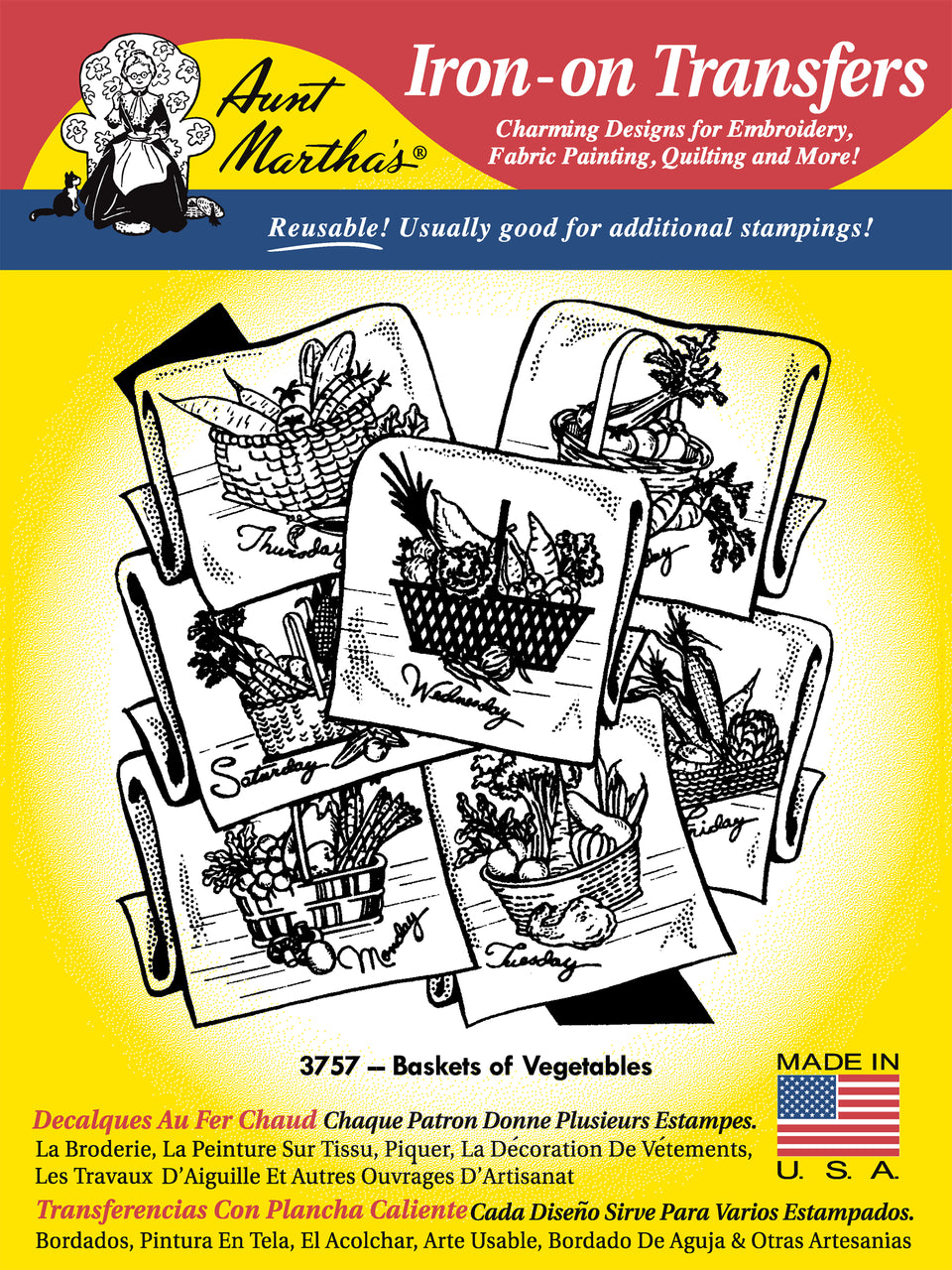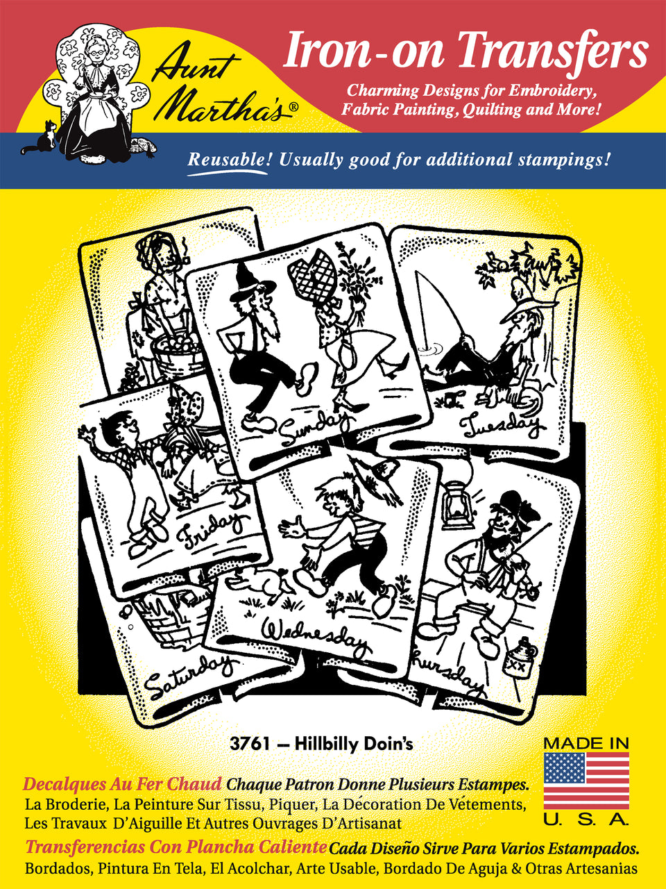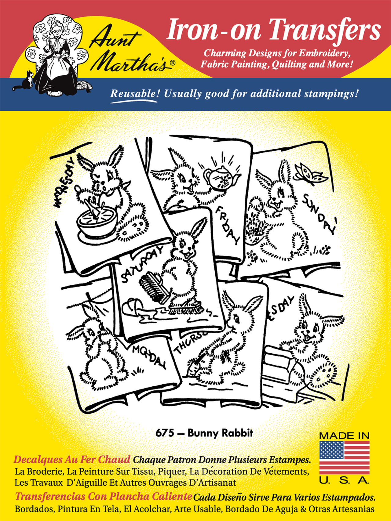 Aunt Martha's Embroidery Transfer Patterns with Days of the Week (DOW) designs. Many of these embroidery designs will feature the traditional old-fashioned chores for each day of the week ~ Monday (Wash Day), Tuesday (Iron Day), Wednesday (Mend Day), Thursday (Market Day), Friday (Clean Day), Saturday (Bake Day), Sunday (Rest Day). Transfer the pattern onto your fabric with a hot iron... use hand stitch embroidery or liquid embroidery paints to finish!