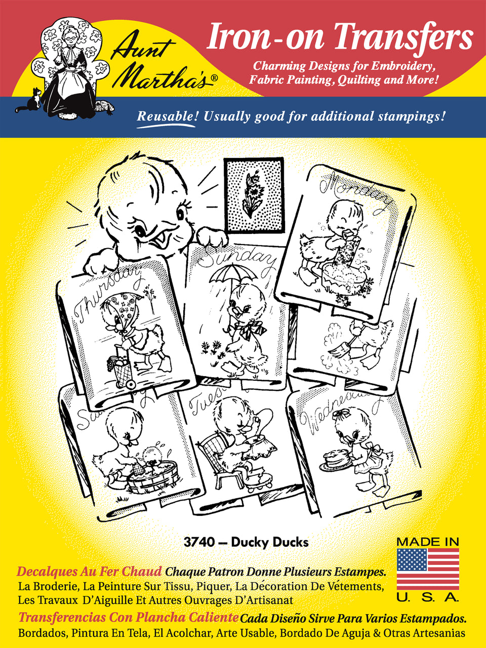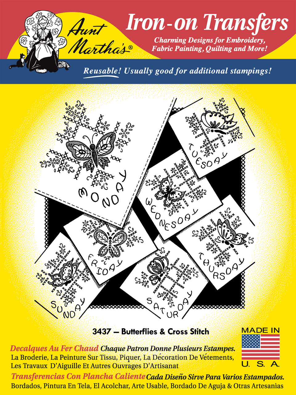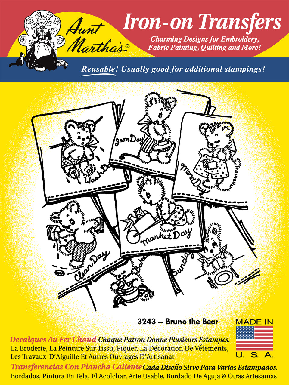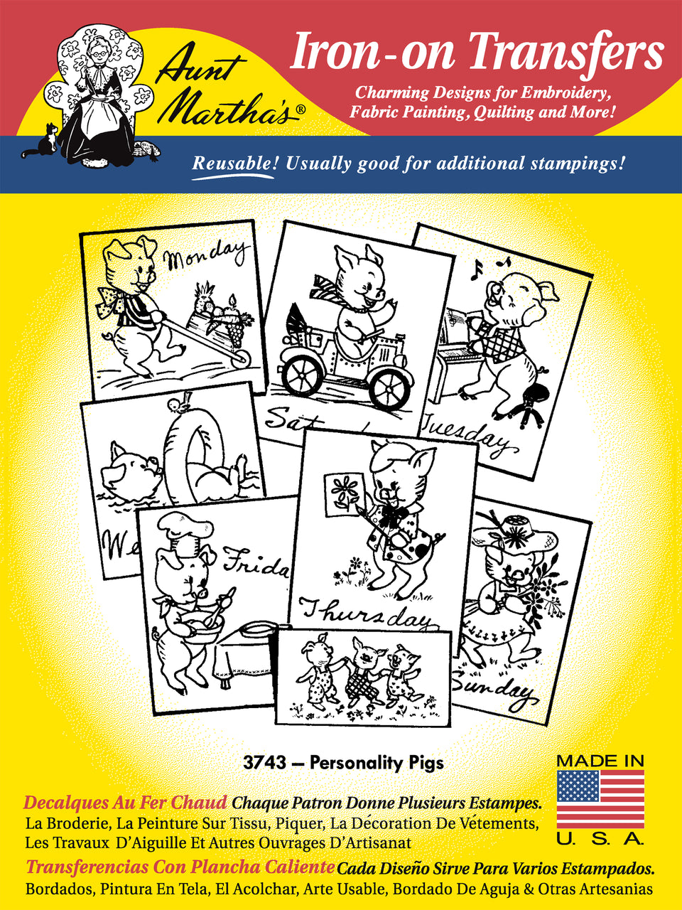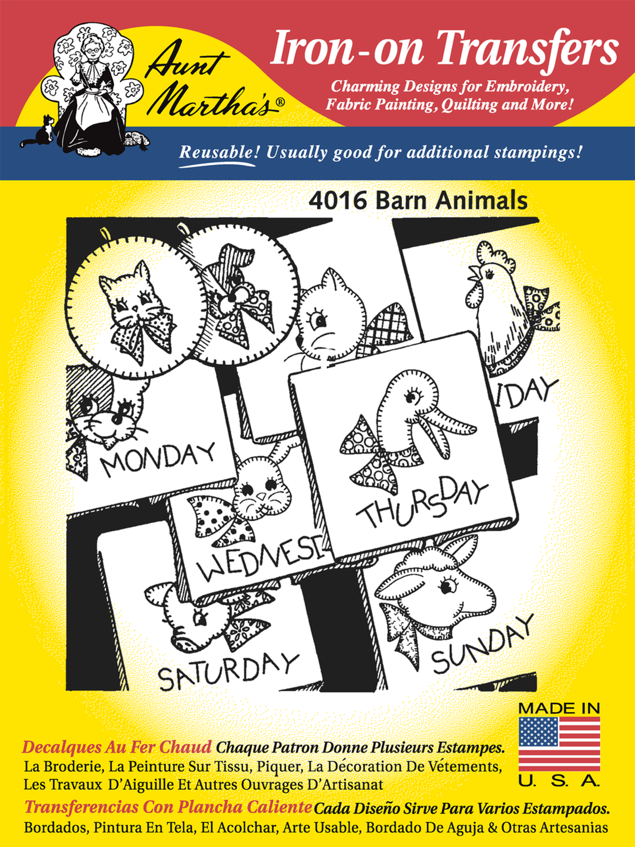 Aunt Martha's Embroidery Transfer Patterns with Days of the Week (DOW) designs. Many of these embroidery designs will feature the traditional old-fashioned chores for each day of the week ~ Monday (Wash Day), Tuesday (Iron Day), Wednesday (Mend Day), Thursday (Market Day), Friday (Clean Day), Saturday (Bake Day), Sunday (Rest Day). Transfer the pattern onto your fabric with a hot iron... use hand stitch embroidery or liquid embroidery paints to finish!