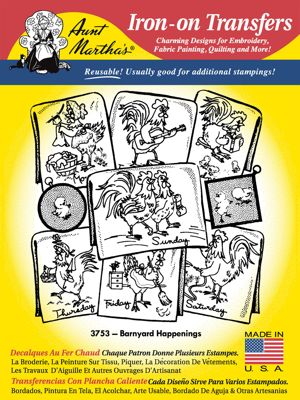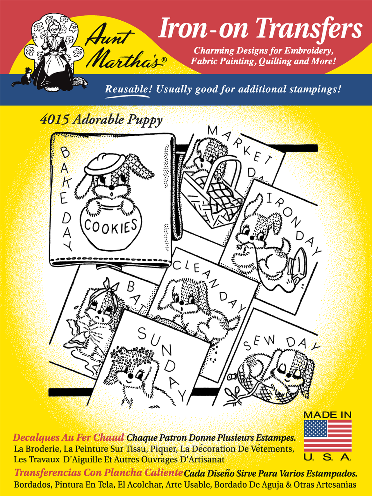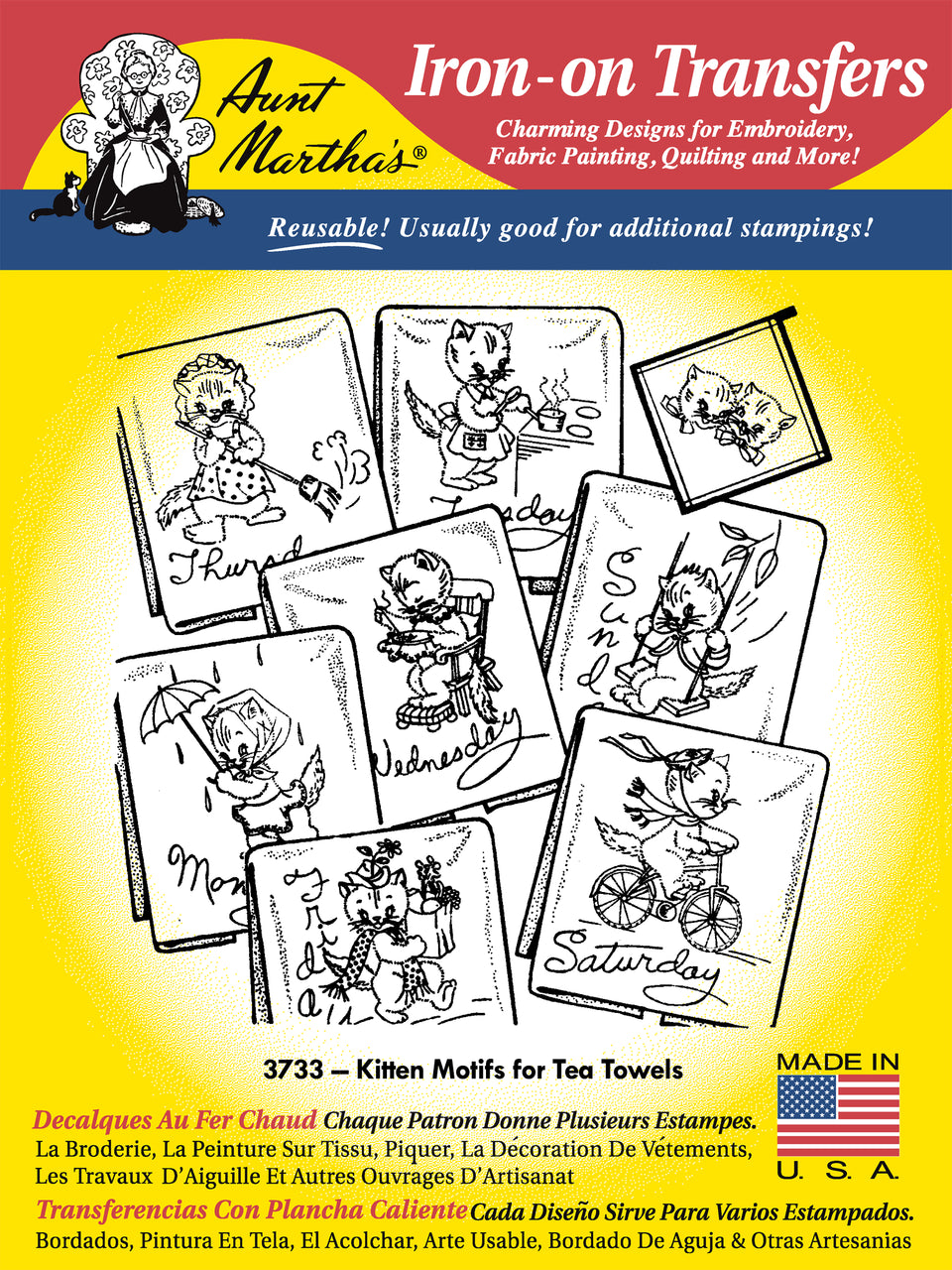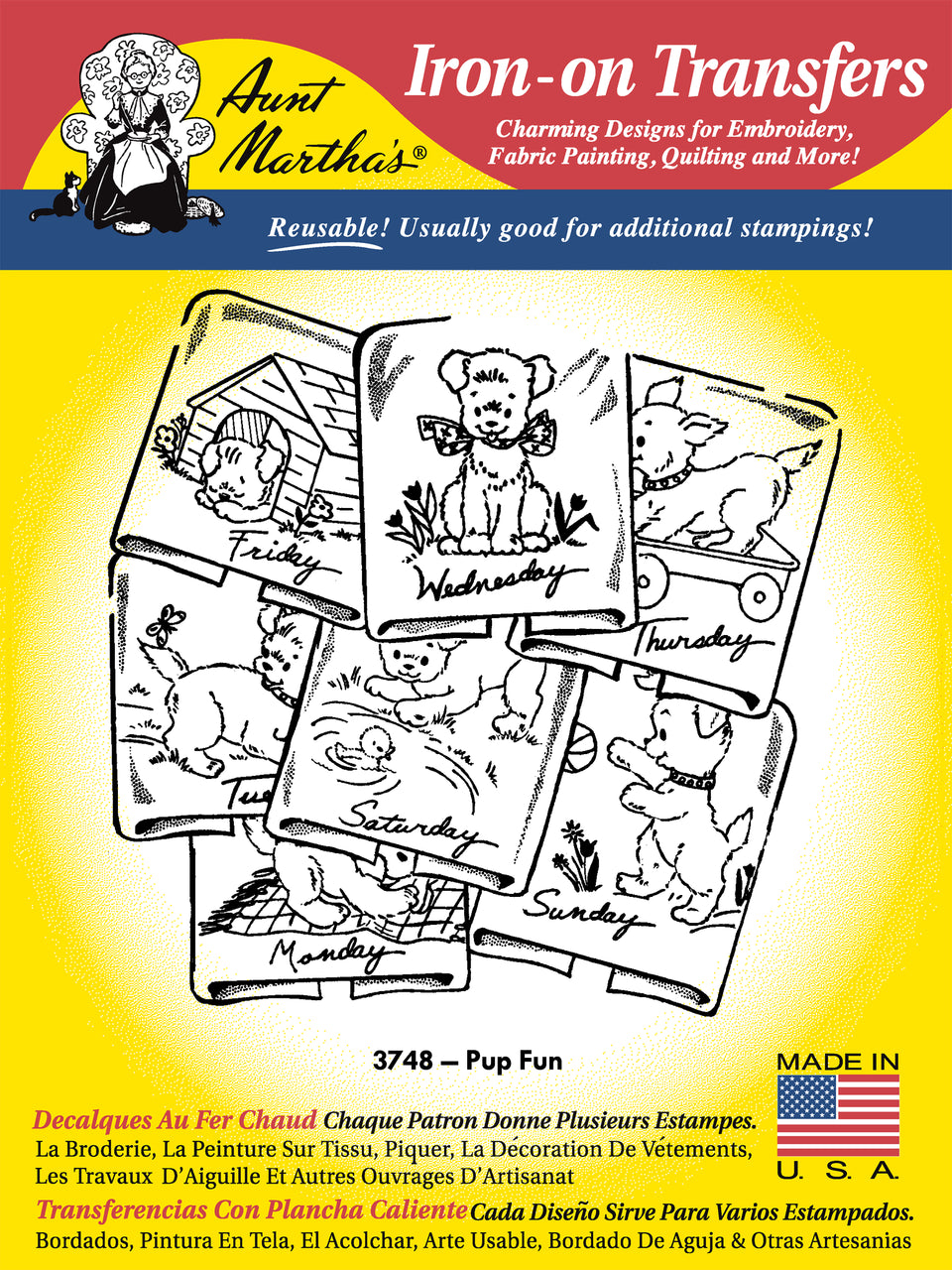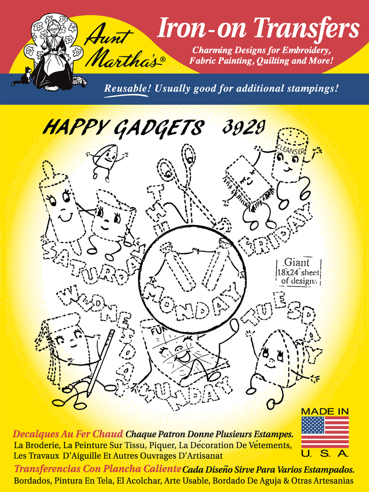 Aunt Martha's Embroidery Transfer Patterns with Days of the Week (DOW) designs. Many of these embroidery designs will feature the traditional old-fashioned chores for each day of the week ~ Monday (Wash Day), Tuesday (Iron Day), Wednesday (Mend Day), Thursday (Market Day), Friday (Clean Day), Saturday (Bake Day), Sunday (Rest Day). Transfer the pattern onto your fabric with a hot iron... use hand stitch embroidery or liquid embroidery paints to finish!