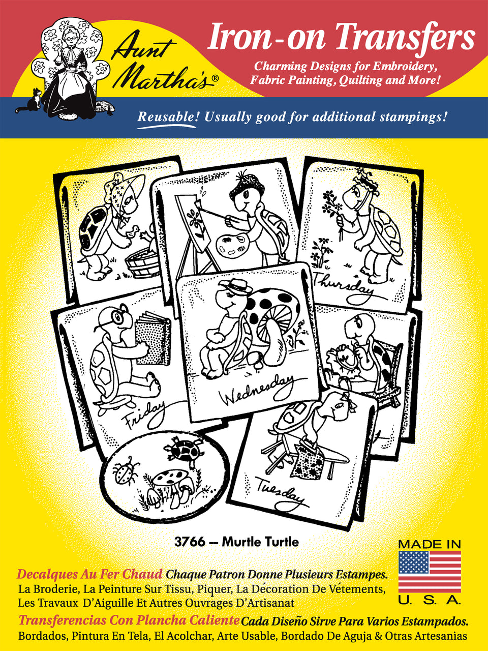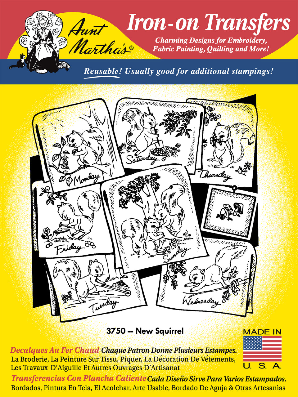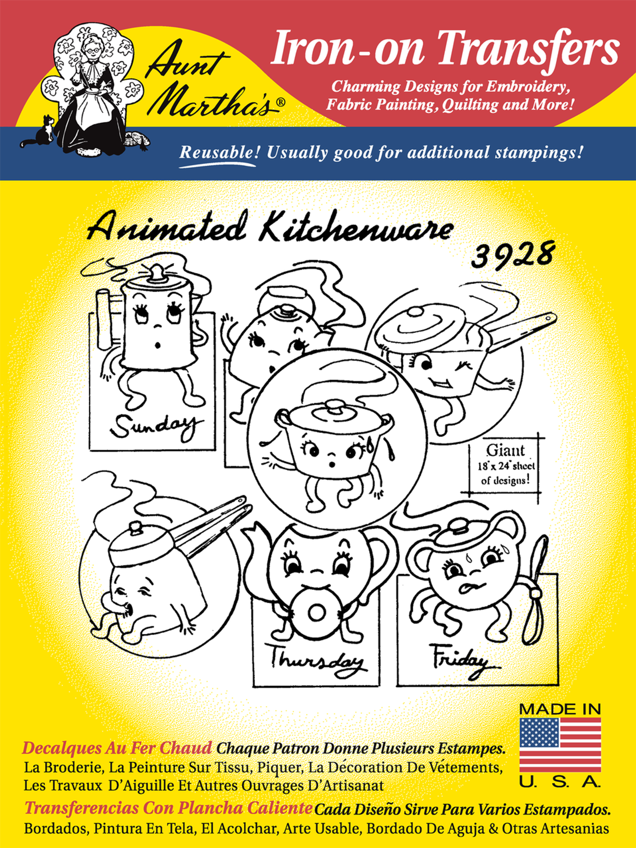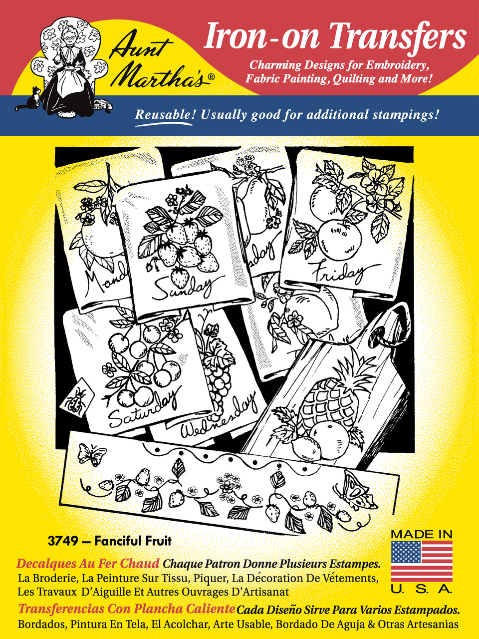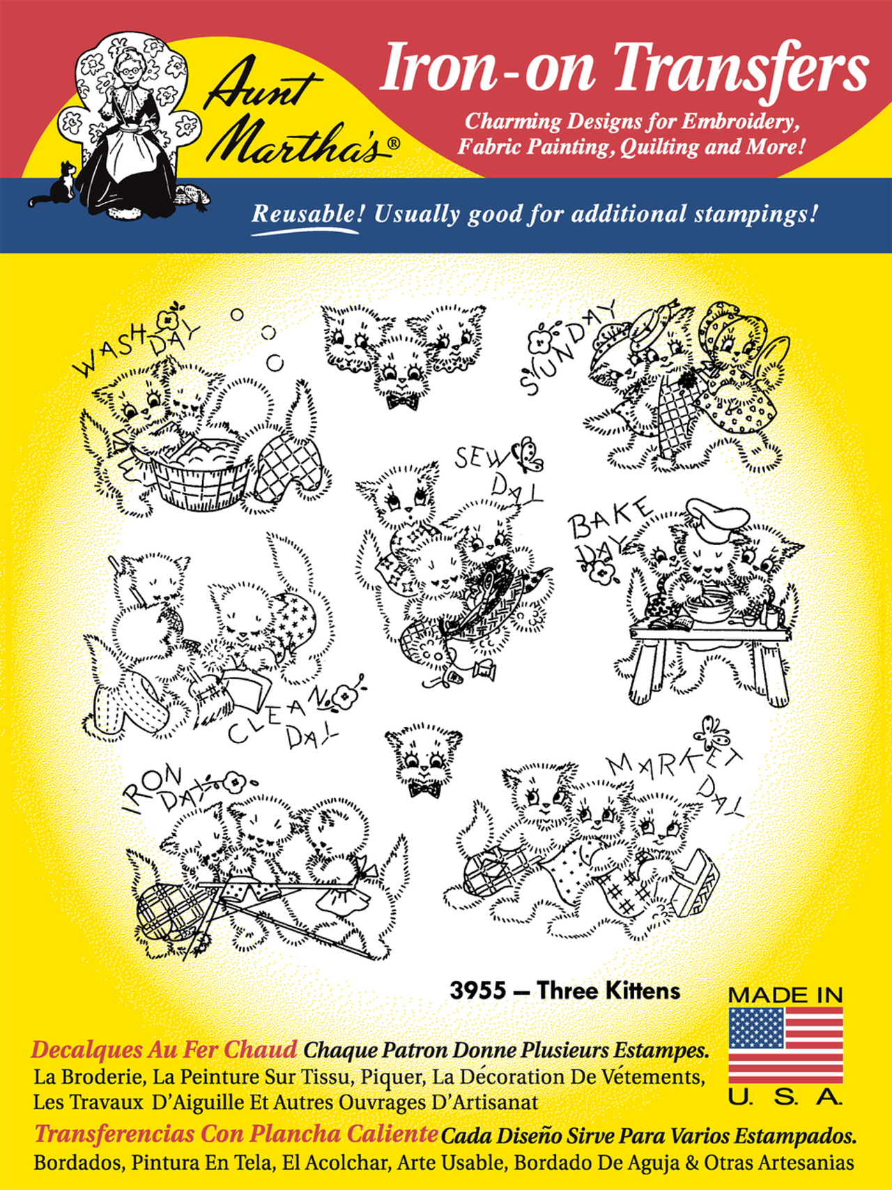 Aunt Martha's Embroidery Transfer Patterns with Days of the Week (DOW) designs. Many of these embroidery designs will feature the traditional old-fashioned chores for each day of the week ~ Monday (Wash Day), Tuesday (Iron Day), Wednesday (Mend Day), Thursday (Market Day), Friday (Clean Day), Saturday (Bake Day), Sunday (Rest Day). Transfer the pattern onto your fabric with a hot iron... use hand stitch embroidery or liquid embroidery paints to finish!