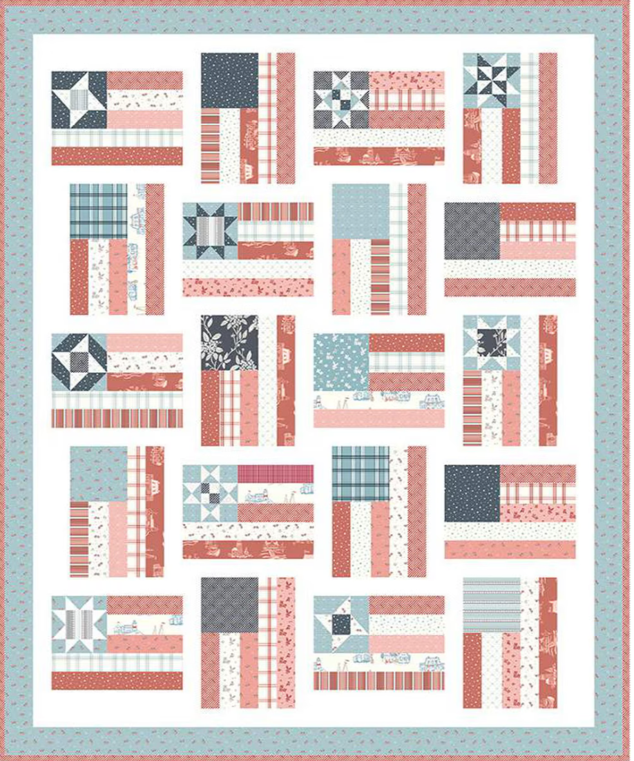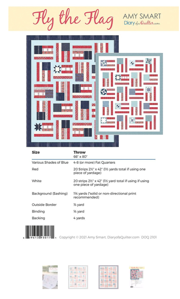 The Fly the Flag Quilt by Amy Smart of Diary of a Quilter includes and flag with 4 different star block patterns with multiple variations per block. The 18 page pattern includes color photos and diagrams. Finished size is 66" x 80".