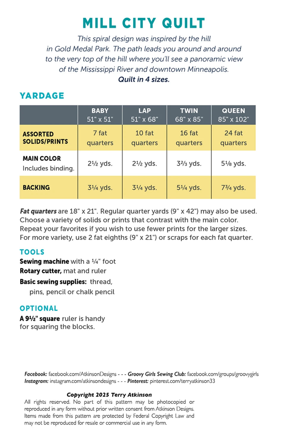 Mill City Quilt's spiral design was inspired in Minneapolis by the hill in Gold Medal Park. Fat quarter OR yardage friendly. Quilt available in four sizes: baby, lap, twin, and queen. No special tools required.
