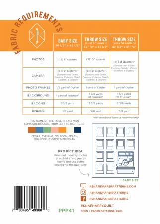 Smile for the camera! Snap Happy, recommended for advanced beginner sewist & up, is a charm square & fat quarter-friendly pattern that includes instructions for making a baby size (36 1/2" x 42 1/2") and throw size quilt (52 1/2" x 61 1/2"). The pattern features separate cutting instructions for the Camera block (14" x 17") which allows for easy incorporation into smaller projects. Snap Happy primarily consists of straight seams making for speedy quilt top assembly! This 17-page pattern is complete with block diagrams, labels for organizing your cuts of fabric, step-by-step detailed instructions, and colorful illustrations.