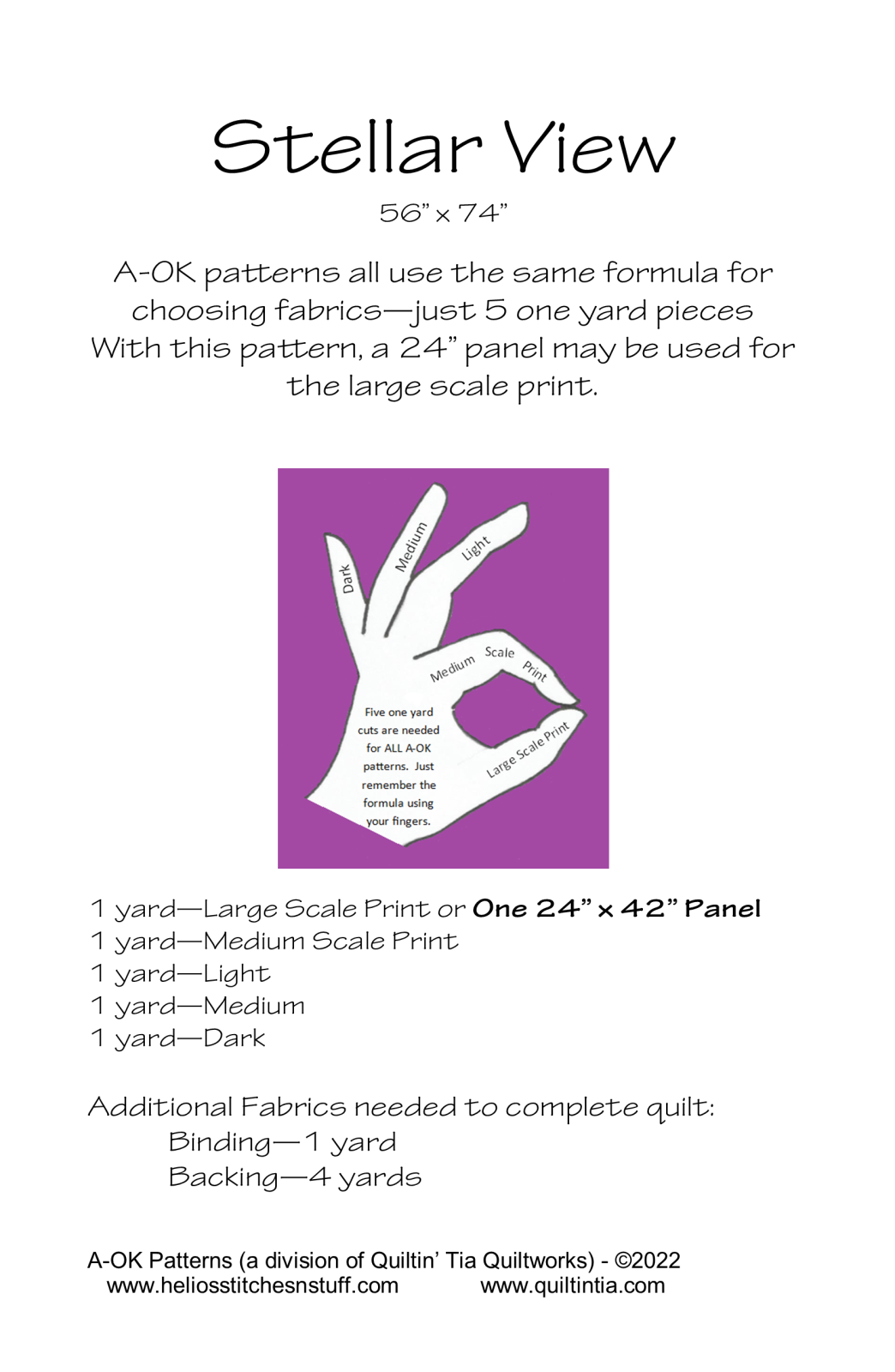 Use the A-OK finger formula to pick your 5 one yard cuts. One large scale print, one medium scale print, one light, one medium, one dark. That is all! Formula works for ALL A-OK patterns. Pick your fabric, pick your pattern.