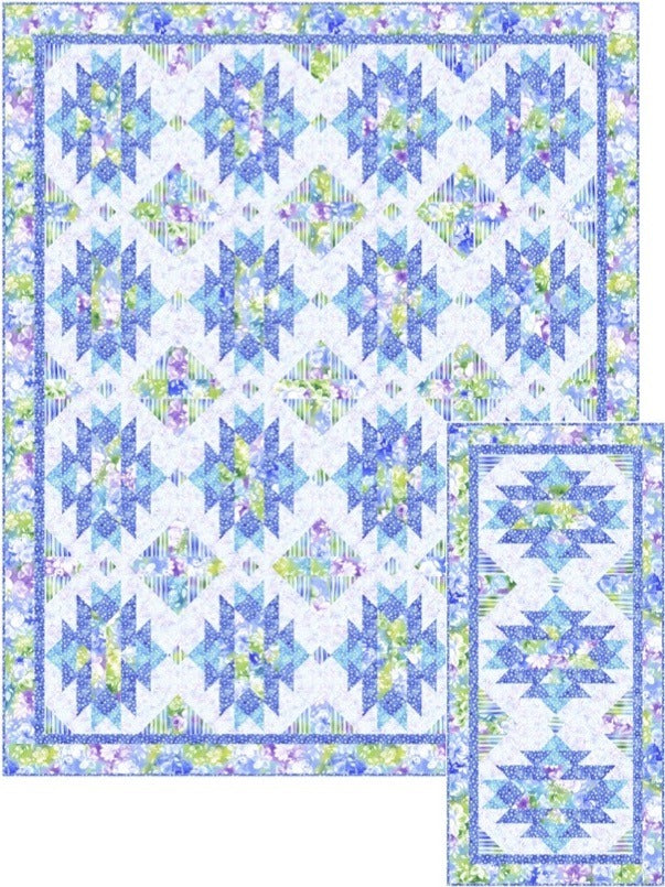 64″ x 78″ throw and 22″ x 47-1/2″ runner. Begin with a simple block, cut it into strips, shuffle them around and put them back together—a block that looks complicated! The runner is the perfect size for a class with Confident Beginner quilters. Otherwise, Intermediate skill level recommended.