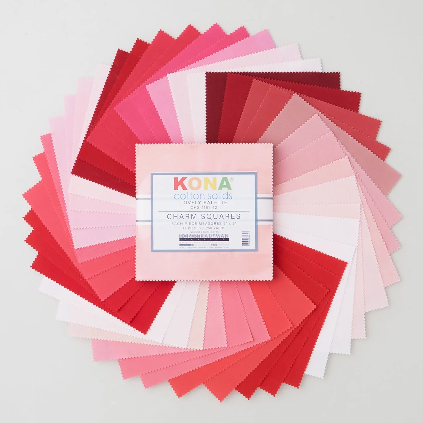 These 5" squares of solid pinks and reds from Kona Cotton's Lovely Palette are perfect for a Valentine's Day or Breast Cancer Awareness project!