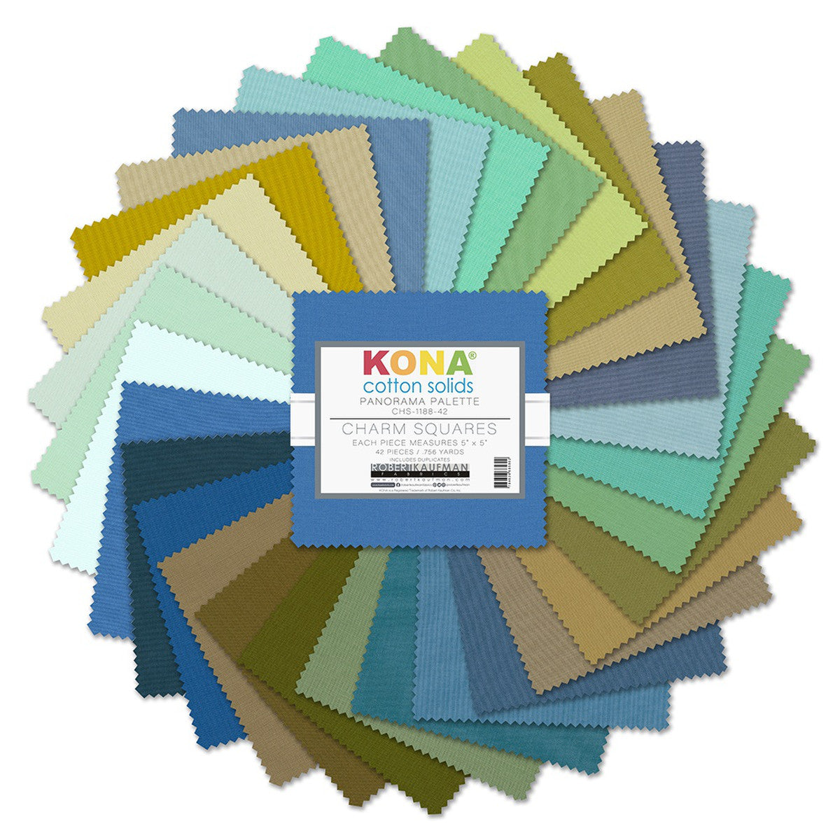 What will you make with the panoramic colors of this 5" pack of solids? The Kona Cotton Panorama Palette features an eclectic range of colors, from neutral greens to soft purples.100% CottonContains 42 5" squares of fabric. Some prints are duplicated. | Robert Kaufman Kona Cotton - Panorama Palette Charm Pack | Basics