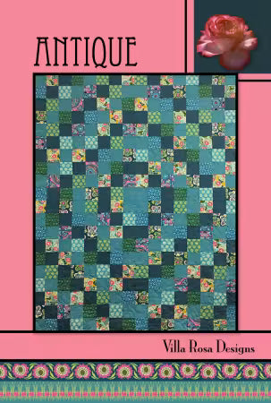 Discover the charm of this beautifully crafted quilt, measuring 56 inches by 70 inches, perfect for adding a touch of vintage elegance to any room. This quilt, titled 'Antique', is made using fat quarters, resulting in a patchwork of rich teal, green, and blue hues with intricate floral and geometric patterns. The design is framed by a delicate pink border, enhancing the antique rose in the corner, symbolizing timeless beauty. The bottom of the quilt features a vibrant strip of floral and geometric motifs, adding a playful yet sophisticated finish.