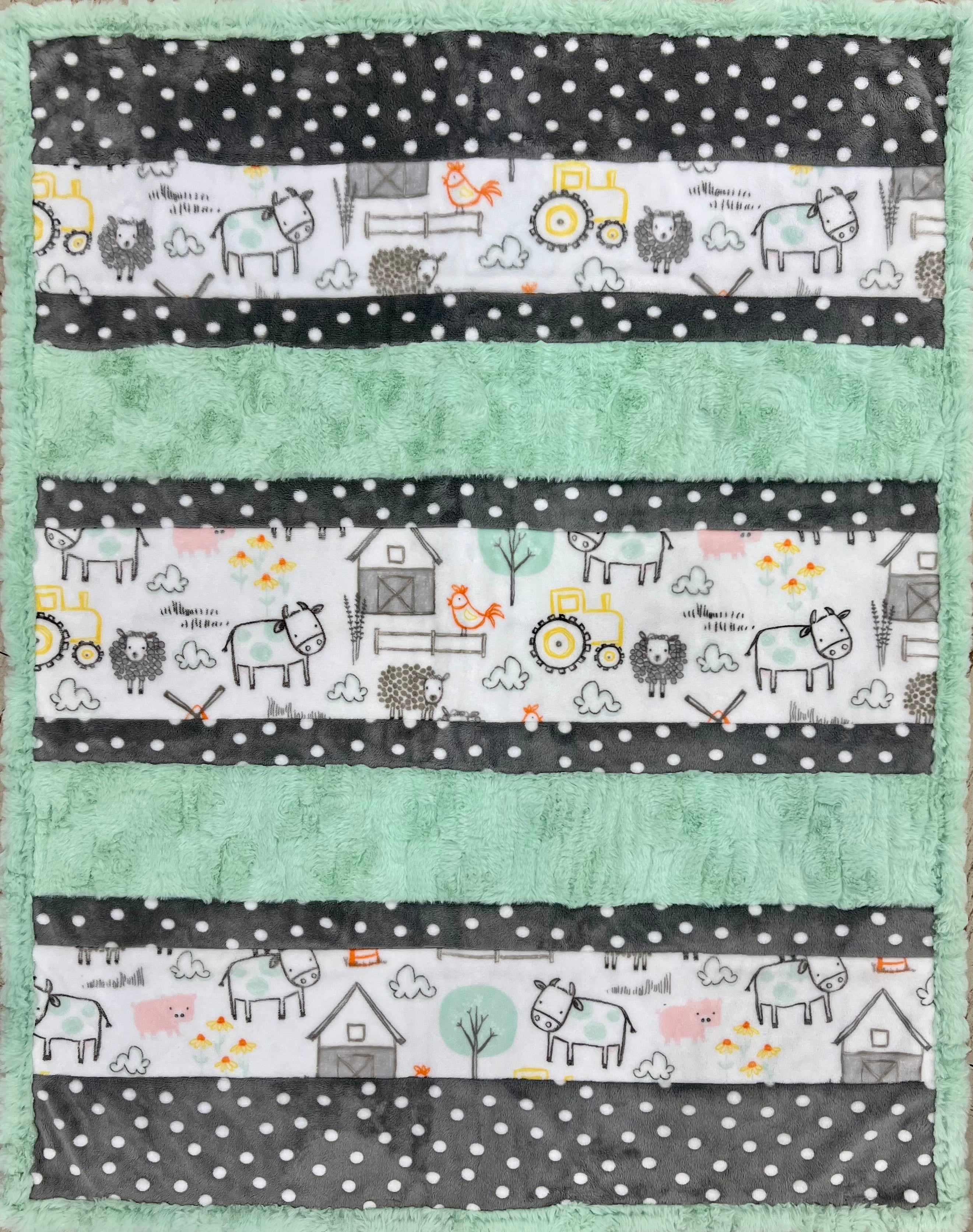 Old MacDonald had a... minky fabric quilt! This farm-themed minky plush quilt kit is about as cute as it gets, and features classic farm animals, tractors and barns illustrated in a fun kid-friendly style. This Bambino Cuddle® kit quilt is approximately 28” by 37” and includes a pattern and strips for the quilt top, backing and binding.