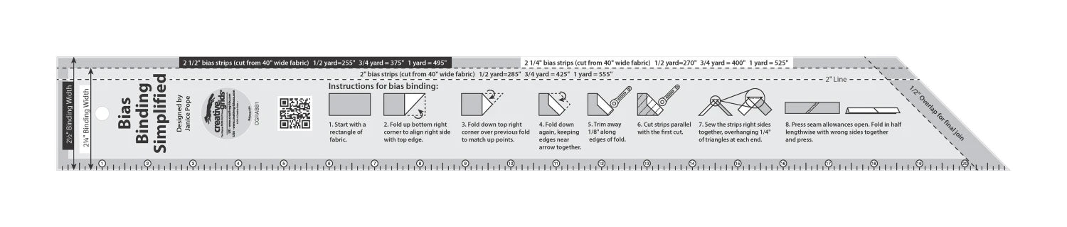 The Bias Binding Simplified Ruler designed by Janice Pope for Creative Grids® has markings to easily cut 2in, 2-1/4in, and 2-1/2in binding strips.