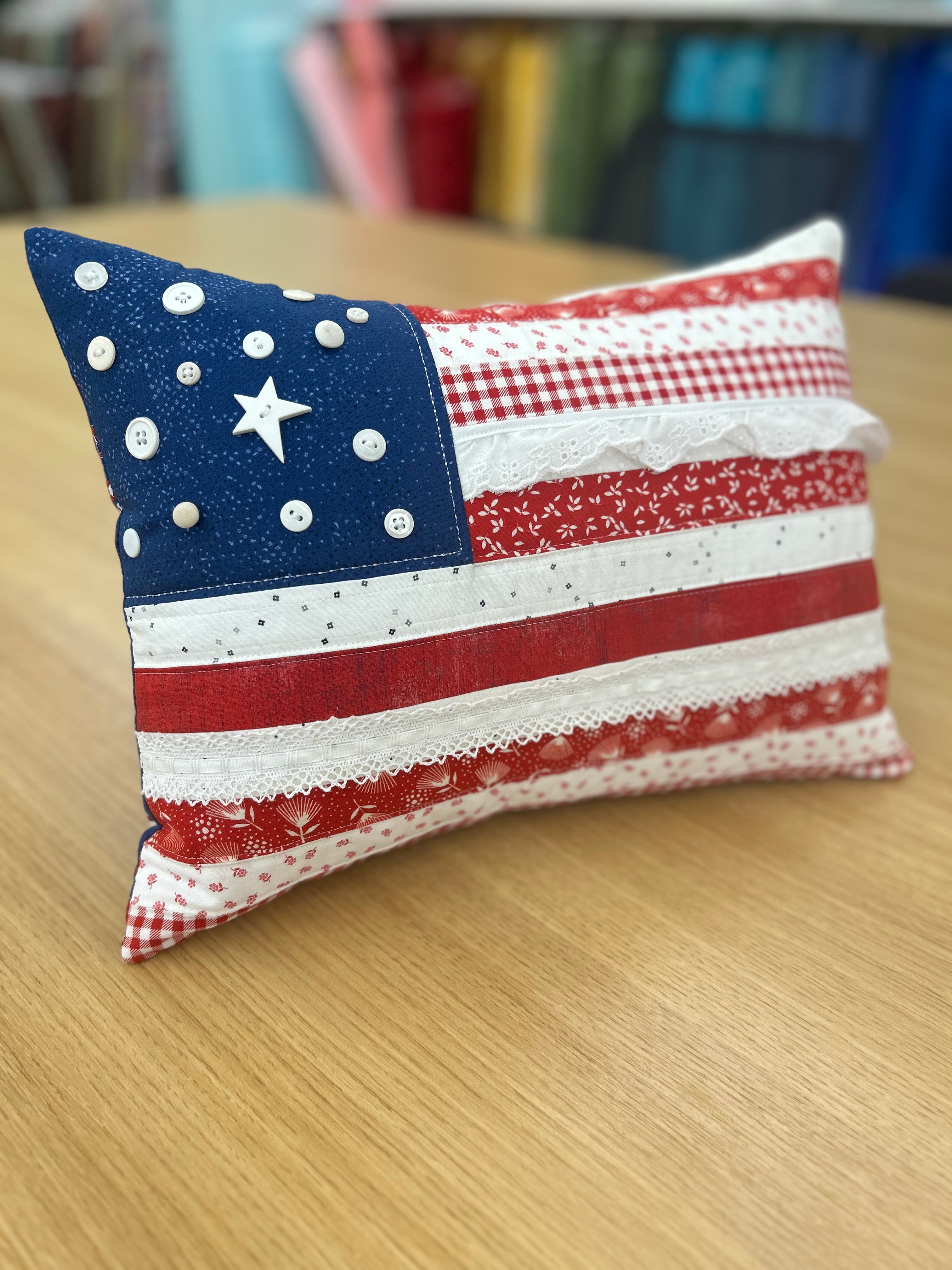 The FREEDOM PILLOW KIT has everything you need for a patriotic pillow! The kit includes all the materials for the pillow front and back, batting and lining for quilting, embellishments, and pattern. Everything but the pillow form! It measures 12 x 15, perfect for adding a touch of Americana to your home.