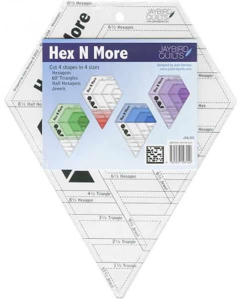The ruler comes with full color instructions, including cutting and piecing diagrams, just like all Jaybird Quilts books and patterns. All of the pieces can be rotary cut from strips. Ruler can cut 4 shapes in 4 sizes: hexagons, 60 degree triangles, half hexagons and jewels.