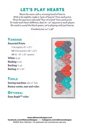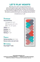 Dive into the fun of quilting with the "Let's Play Hearts" project, where you can create a charming table runner or wall hanging adorned with a series of heart patterns in vibrant colors like teal, red, and grey. This project uses a playful card game theme, where you can 'shoot the moon' with a winning hand of hearts. With 5 fat eighths, you can make a 'pair of hearts' from each print, while 3 fat quarters will yield 'four of a kind' from each print. For a unique twist, deal 10 - 10" squares to each player, ensuring each heart is different. The finished piece measures 14" x 38", perfect for adding a touch of whimsy to your home decor.