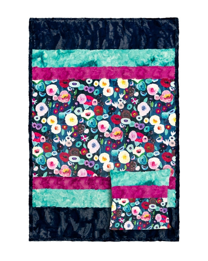 Our Picture Perfect Cuddle® Kit You Grow Girl includes our Flower House Digital Cuddle® Mallard print that elicits feelings of dusk, and is contrasted beautifully with the bright colors of the seemingly-endless meadow of flowers. This quilt and pillow kit also includes our Luxe Cuddle® Glacier Ink (also for the binding), Luxe Cuddle® Galaxy Breeze and Luxe Cuddle® Glacier Claret fabrics. This Picture Perfect Cuddle® Kit quilt is approximately 38" by 58" and includes a pattern, pre-cut strips and binding, and we recommend using Cuddle® 3 Claret, Cuddle® 3 Breeze or Cuddle® 3 Ink for the backing (approximately 1 1/8 yards needed).